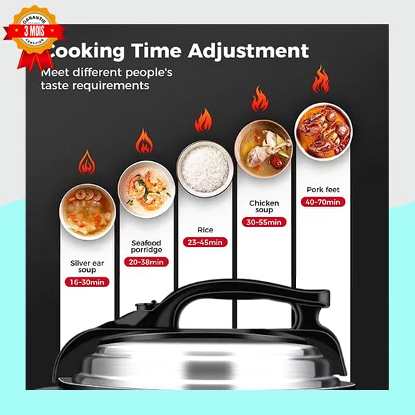 Le panneau de commande numérique clair et convivial vous donne accès à une variété de programmes de cuisson pré-réglés. Que vous souhaitiez cuire de la viande, des légumes, du riz, des soupes ou des ragoûts, sélectionnez simplement la fonction désirée pour un résultat parfait, sans surveillance.