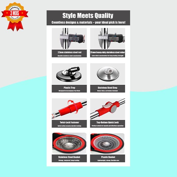 Panier Essoreur Durable : Contrairement aux modèles en plastique fragiles, ce système utilise un panier essoreur en acier inoxydable résistant à la corrosion et conçu pour durer.