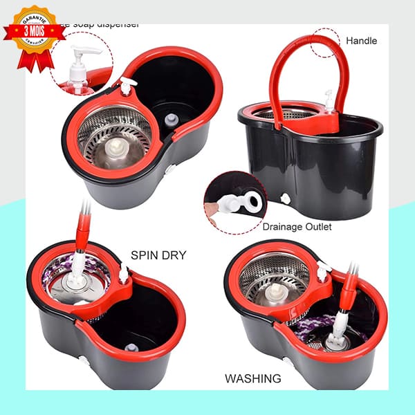 Nettoyez vos sols sans effort et sans vous mouiller les mains grâce à ce système innovant de balai essoreur rotatif à 360° et son seau double fonction. Doté d’un panier d’essorage en acier inoxydable durable et d’un drain de vidange pratique, il rend le nettoyage rapide, hygiénique et efficace pour tous types de surfaces.