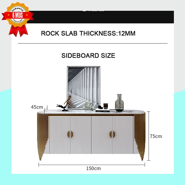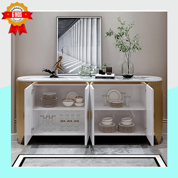 Le Buffet Miroir Doré incarne la sophistication contemporaine. Sa structure sculptée avec rainures verticales et accents dorés attire le regard tout en restant fonctionnelle. Le plateau supérieur en pierre de 12 mm d’épaisseur offre une surface résistante et élégante, idéale pour accueillir objets décoratifs, vases ou sculptures. Le miroir assorti amplifie la lumière et la profondeur de la pièce. Avec ses dimensions généreuses (150 cm de large, 45 cm de profondeur, 75 cm de hauteur), ce buffet est parfait pour les salons, halls ou espaces de réception.