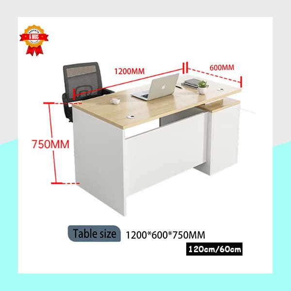 Ce bureau individuel au design robuste et élégant est conçu pour les environnements professionnels exigeants. Son plateau en bois foncé, souligné par une structure noire, offre une surface de travail spacieuse et résistante. Le passe-câble circulaire situé à gauche du plateau permet une gestion discrète des fils et appareils électroniques. Sur le côté droit, trois tiroirs à poignées argentées assurent un rangement pratique et sécurisé pour les documents et fournitures. L’ensemble repose sur un support en carton, suggérant une phase de préparation ou de livraison. Le badge “6 Months” en haut à gauche peut être utilisé comme élément marketing pour une garantie de 6 mois ou une promotion temporaire.