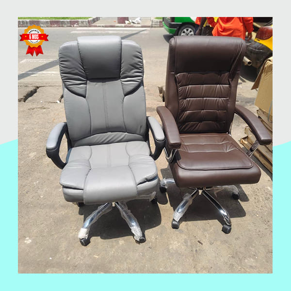 Ce fauteuil de bureau directionnel en cuir synthétique marron incarne la sobriété élégante des environnements professionnels haut de gamme. Son dossier haut rembourré, souligné par des coutures horizontales, offre un soutien structuré et confortable. Les accoudoirs fixes assurent une posture détendue, tandis que la base chromée pivotante à roulettes garantit une mobilité fluide. Ce modèle est idéal pour les bureaux de direction, les postes de télétravail premium ou les espaces d’accueil raffinés. Les roulettes sont encore partiellement protégées par un emballage plastique, signe de produit neuf. Le badge “6 MOS” confirme une garantie de 6 mois, gage de fiabilité.