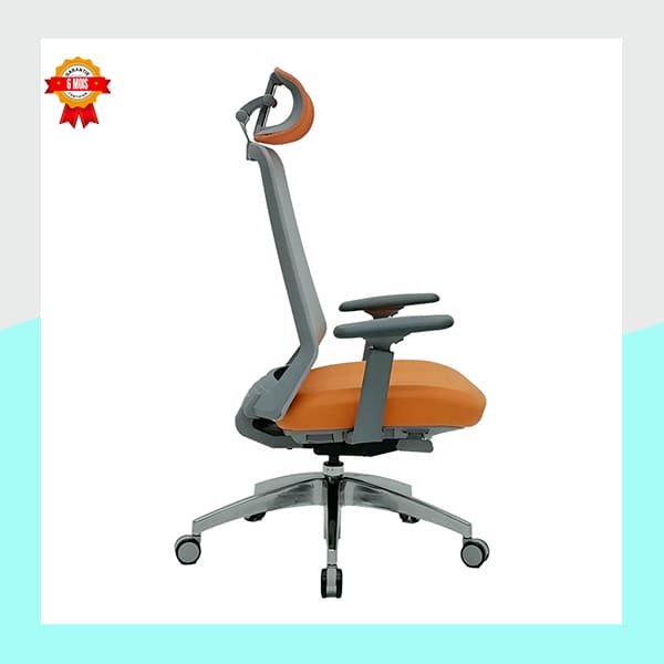 Le dossier haut en maille respirante favorise une excellente circulation de l’air, vous gardant au frais et à l’aise même pendant les longues heures de travail. Il épouse la courbe naturelle de votre dos pour un soutien lombaire optimal. L’assise rembourrée de couleur orange vive offre un confort moelleux et dynamique.