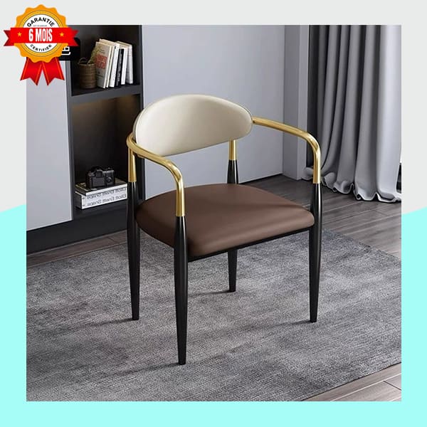 Cette chaise incarne l’élégance contemporaine avec son dossier blanc incurvé, son assise camel moelleuse et ses accoudoirs métalliques aux reflets dorés. Les pieds fuselés noirs renforcent son allure graphique tout en assurant une excellente stabilité. Elle s’intègre naturellement dans les salons raffinés, les bureaux créatifs ou les espaces d’accueil haut de gamme. Garantie 6 mois, elle offre une assise confortable et une présence visuelle affirmée.