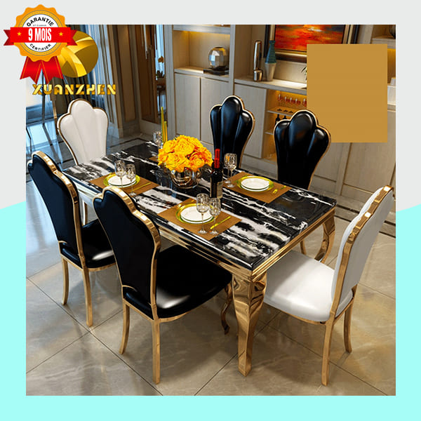 Les quatre chaises assorties se distinguent par leur design chic et leur confort. Elles sont revêtues d’un similicuir blanc de haute qualité, facile à entretenir et offrant une assise agréable. Leurs structures en métal doré reprennent les finitions de la table, créant une harmonie visuelle sophistiquée. Le dossier haut et légèrement incurvé offre un bon soutien, tandis que les pieds fins en métal doré complètent l’allure moderne et luxueuse de l’ensemble.