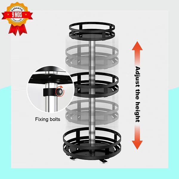 Dites adieu aux placards en désordre grâce à cette étagère pratique. Elle est équipée de trois plateaux rotatifs à 360 degrés, vous permettant de faire pivoter chaque niveau pour atteindre facilement les articles à l’arrière. La structure en métal noir et les montants argentés sont robustes et durables. Le bas de l’étagère est muni de ventouses pour une meilleure stabilité.