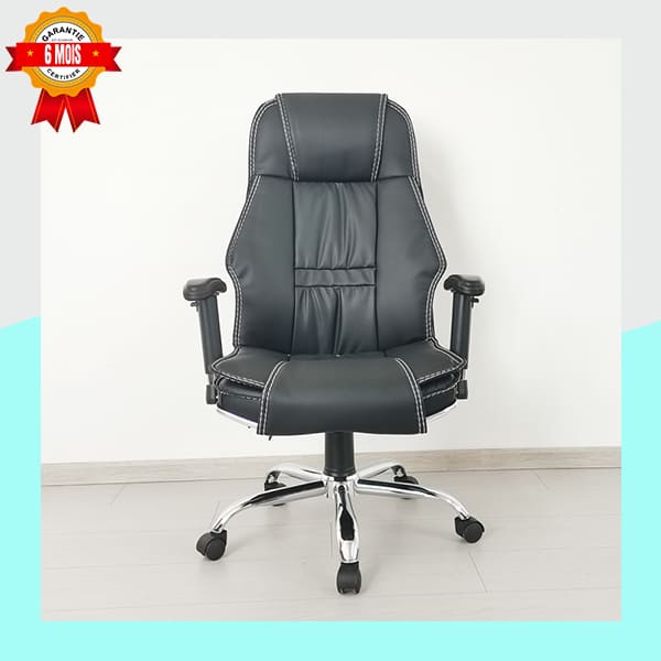 Le Fauteuil VistaLine conjugue confort ciblé et esthétique contemporaine. Son revêtement noir en similicuir, souligné de surpiqûres marron, évoque la sobriété haut de gamme des espaces de travail en hauteur. Le dossier haut, les accoudoirs rembourrés et la base chromée à roulettes assurent une posture stable et une mobilité fluide. Placé dans un bureau lumineux avec vue sur la ville, il incarne la posture du professionnel moderne, entre performance et élégance.