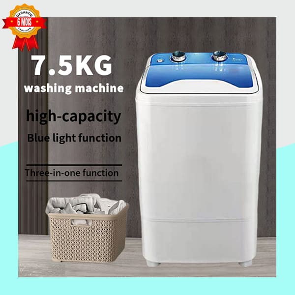 Simplifiez votre lessive avec cette mini machine à laver semi-automatique 3-en-1 d'une capacité généreuse de 7.5KG. Compacte et puissante, elle lave, rince et essore (grâce à son panier de drainage inclus). Profitez de la fonction lumière bleue (UV) pour un nettoyage en profondeur. Livrée avec une brosse spéciale pour nettoyer vos chaussures sans effort. Garantie 6 Mois.