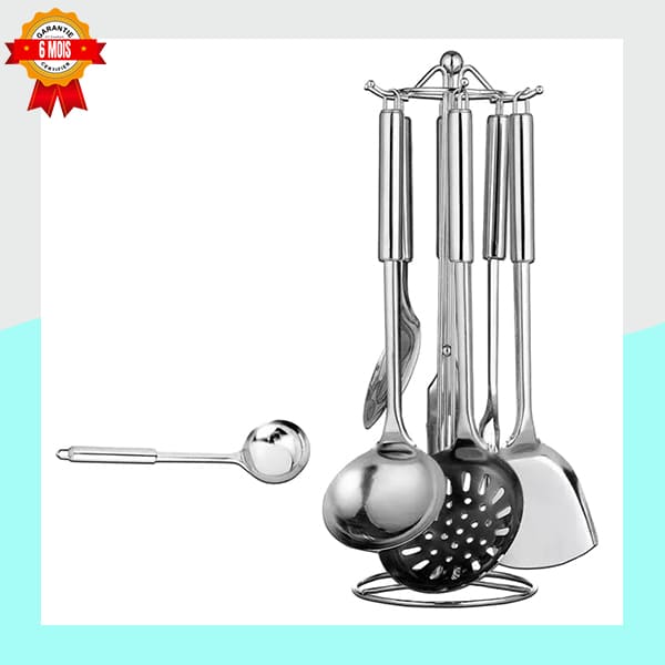 Un set complet et professionnel pour votre cuisine ! Ce lot de 6 ustensiles en acier inoxydable (argenté) inclut les outils indispensables : louche, spatules, écumoire et cuillère à pâtes. Ils sont robustes, résistants à la chaleur et faciles à nettoyer. Parfaits pour la cuisine de tous les jours. Garantie 6 mois incluse.