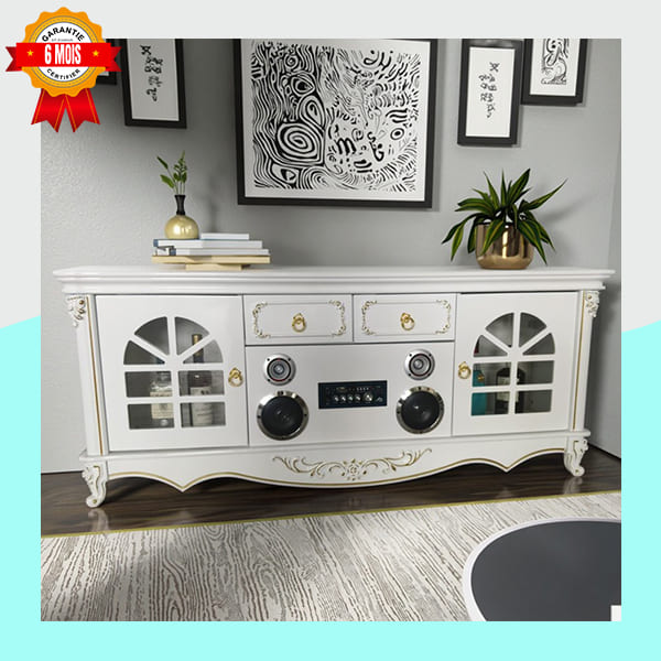 | Rangements | Deux tiroirs centraux, deux vitrines latérales avec portes en verre |