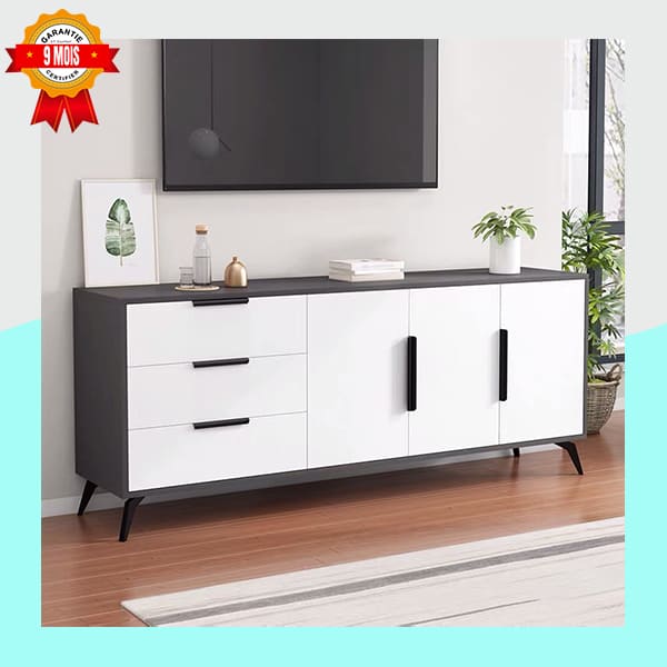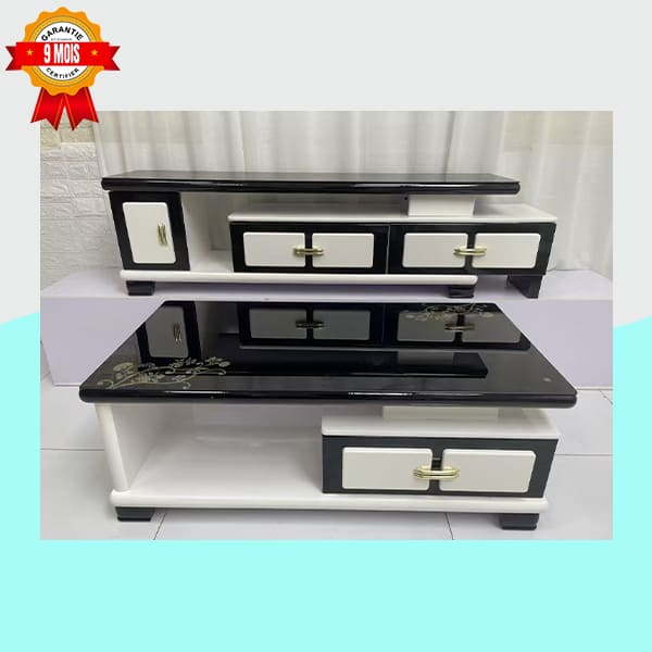 Le meuble TV est doté de multiples options de rangement, incluant des tiroirs et des compartiments fermés, pour vous aider à organiser vos appareils électroniques et accessoires. La table basse assortie propose un tiroir central et des espaces ouverts, idéaux pour ranger magazines, télécommandes ou autres objets du quotidien. Fabriqué avec des matériaux robustes, cet ensemble est non seulement esthétique mais aussi durable.