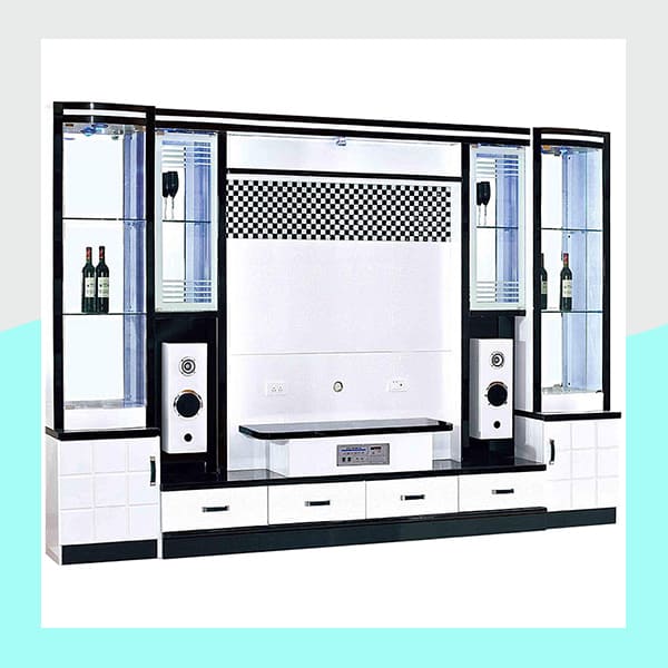 L’ensemble se compose d’une unité centrale pour accueillir votre téléviseur et de deux hautes vitrines latérales équipées d’un éclairage LED pour mettre en valeur vos bouteilles, verrerie ou bibelots. Les multiples tiroirs et placards situés à la base vous offrent un espace de rangement généreux et discret.