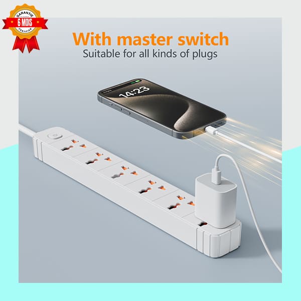 Optimisez votre espace et protégez vos appareils ! Cette multiprise 6 prises universelles est conçue pour accueillir tous types de fiches (européennes, américaines, etc.). Dotée d’une protection parafoudre intégrée, d’un interrupteur marche/arrêt et d’un long câble, elle offre sécurité et flexibilité maximale. Garantie 6 Mois incluse.