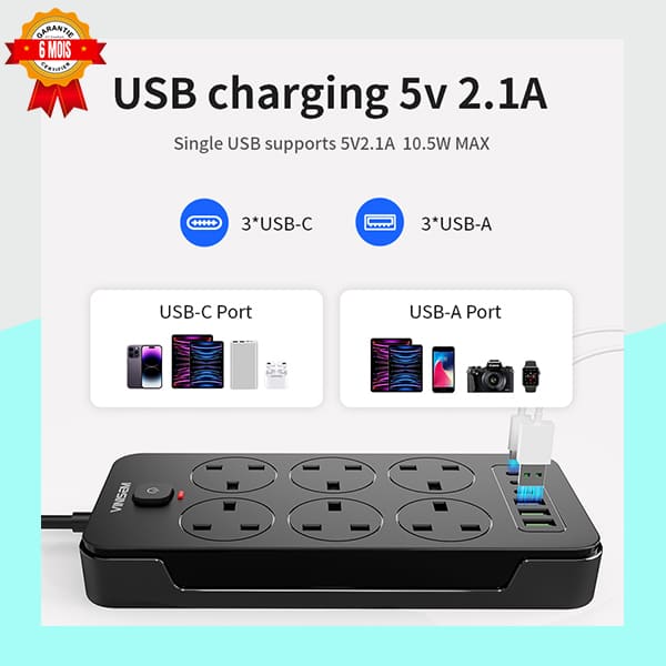 Optimisez votre espace et rechargez tous vos appareils simultanément avec notre Multiprise UK Garantie 6 Mois. Équipée de 4/6 prises universelles (selon le modèle) et de multiples ports USB (Type-C et Type-A) offrant une charge rapide de 5V/2.1A (10.5W MAX par port). Parfaite pour la maison et le bureau, elle combine sécurité, puissance et polyvalence.