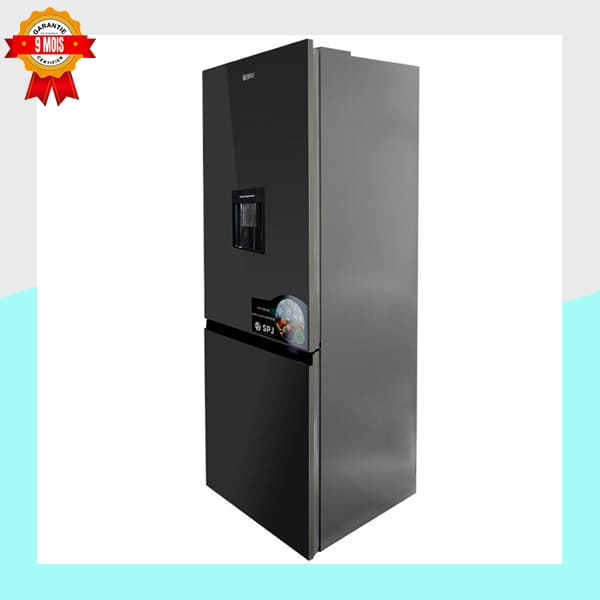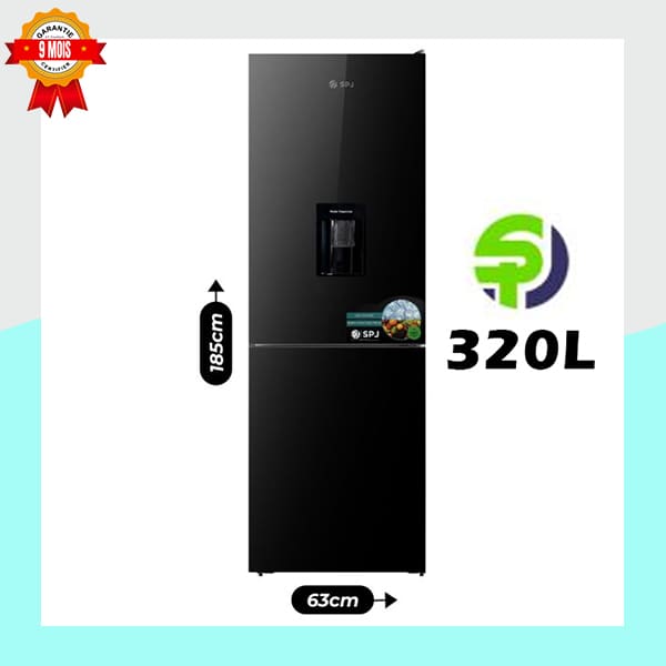 Équipé et élégant, le Réfrigérateur Combiné SPJ de 320 Litres répond à tous vos besoins de conservation. Son design noir moderne est rehaussé par un pratique distributeur d’eau intégré en façade. Avec une hauteur de 185 cm et une largeur de 63 cm, il optimise l’espace vertical. Il assure une conservation fiable de vos aliments frais et congelés, et est couvert par une garantie de 9 mois.
