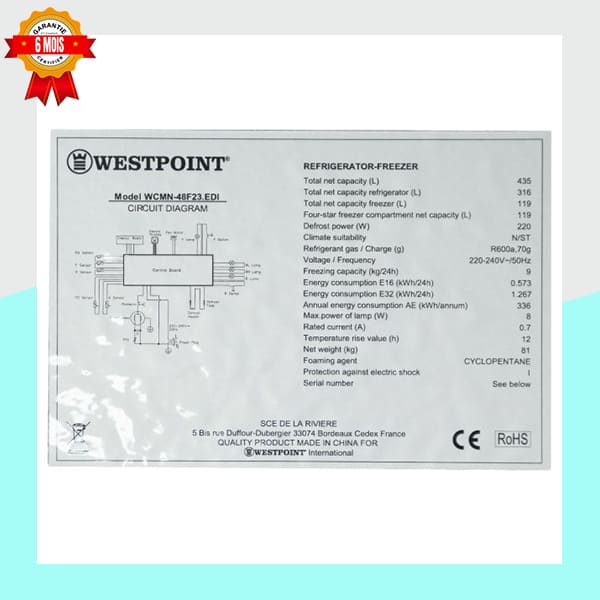Avec une hauteur de 193 cm et une largeur de 70 cm, ce réfrigérateur combine un grand volume avec un encombrement au sol optimisé. Cet appareil de la marque WESTPOINT est couvert par une garantie de 6 mois.