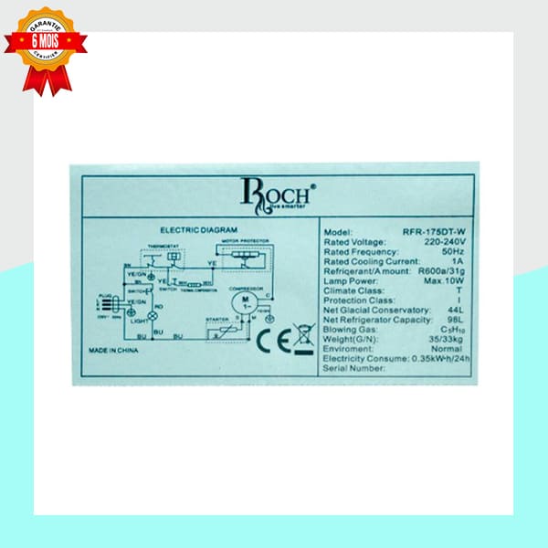 Ce modèle Roch se distingue par son efficacité énergétique, ne consommant que 0.35 kWh par 24 heures. Son fonctionnement est assuré par le réfrigérant écologique R600a, garantissant une réfrigération rapide et performante.