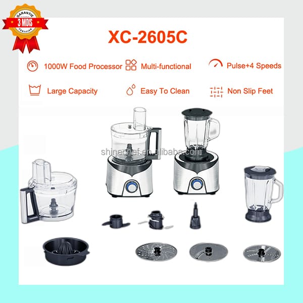 Le Robot de Cuisine Multifonction XC-2605C est l’allié parfait pour tous les passionnés de cuisine. Grâce à son moteur haute performance et sa multitude d’accessoires, il gère sans effort toutes les tâches de préparation, du hachage fin au mélange onctueux.
