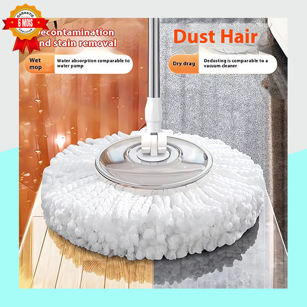 Ce système de balai et seau utilise la technologie d’essorage rotatif à 360° pour retirer l’excès d’eau de la serpillère en microfibre. L’essoreur est fabriqué en acier inoxydable durable, résistant à la rouille et garantissant une longue durée de vie. Plus besoin de se pencher ou de se salir les mains : l’essorage s’effectue par une simple pression.