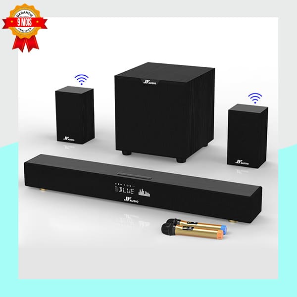 Transformez votre divertissement avec cette Barre de Son puissante, son Caisson de Basses sans fil et ses deux enceintes satellites. Profitez d’un son immersif pour les films et d’une expérience Karaoké unique grâce aux deux microphones sans fil inclus. Connectivité Bluetooth et multiples ports. Garanti 9 mois.
