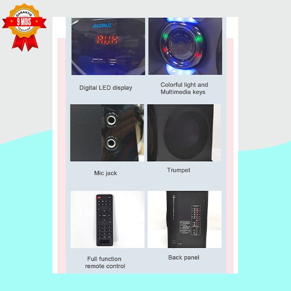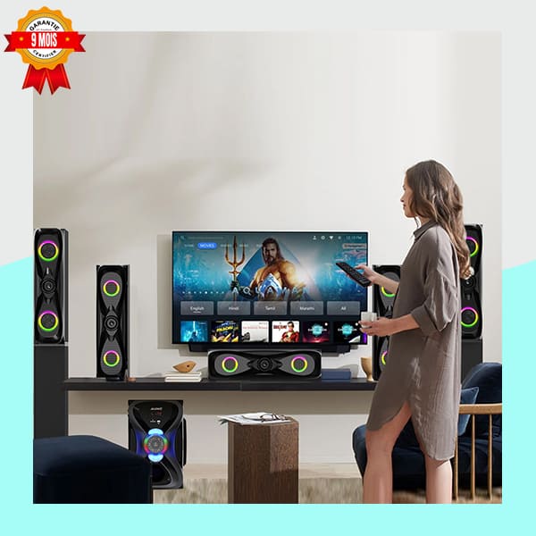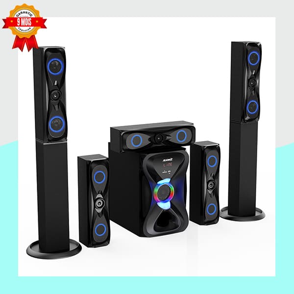 Plongez au cœur de l’action avec ce système Home Cinéma 5.1 ALONX haute puissance ! Doté d’un subwoofer de 8 pouces, il délivre un son stéréo riche et des basses profondes. Connectez-vous facilement via Bluetooth, USB, SD, ou Aux. Équipé d’un micro jack, d’une radio FM et d’un éclairage LED coloré, il transforme votre salon en salle de spectacle. Garantie de 9 mois incluse.