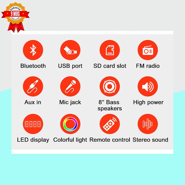 | Connectivité | Bluetooth, USB, SD Card slot, Aux in |