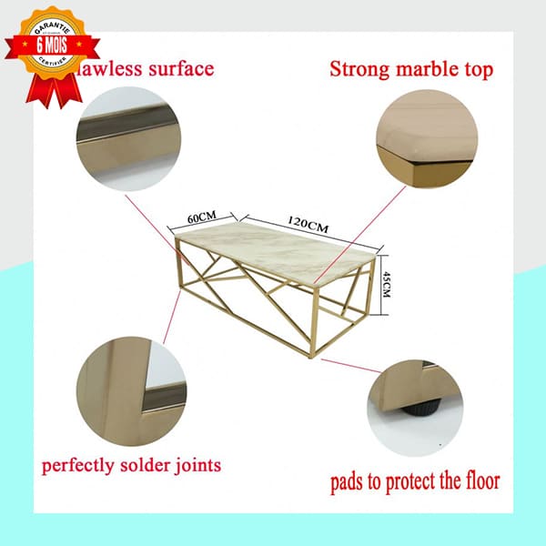 | Design | Plateau en marbre blanc · Structure dorée géométrique · Élégance minérale |