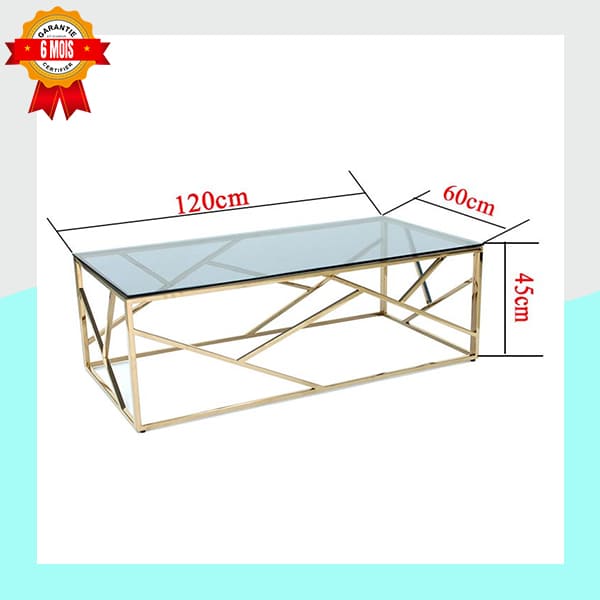 | Design | Plateau en verre · Structure dorée géométrique · Style minimaliste chic |