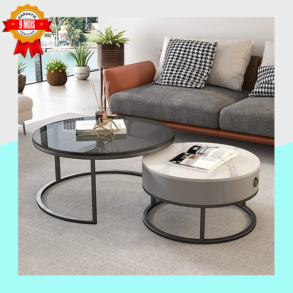 Transformez votre salon avec cet ensemble de deux tables basses gigognes au design sophistiqué. Elles allient harmonieusement différents matériaux et finitions pour un look unique. L’une des tables présente un plateau effet marbre élégant et un tiroir de rangement pratique, tandis que l’autre est dotée d’un plateau en verre trempé fumé, apportant une touche de légèreté et de modernité.