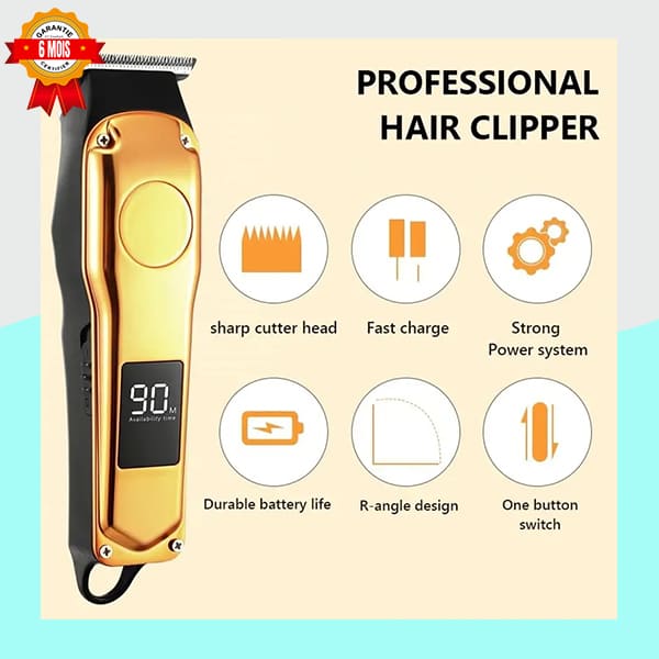 Tondeuse à cheveux professionnelle, élégante en noir et or, conçue pour une coupe de précision et un contrôle total. Dotée d’un moteur puissant, d’une charge rapide et d’un écran numérique affichant l’autonomie restante (90 minutes). Livrée avec 5 sabots pour des longueurs de 1mm à 5mm. Idéale pour les coupes, les contours et les finitions. Garantie 6 mois.