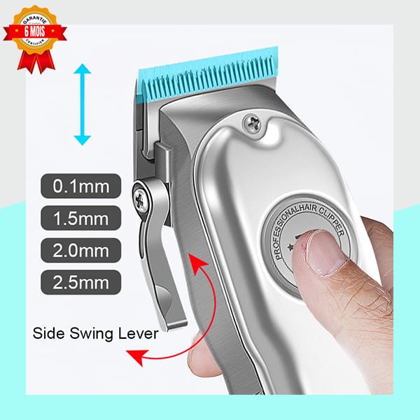 Équipée d’un moteur robuste délivrant 6500 tours par minute (RPM), cette tondeuse coupe tous les types de cheveux sans effort et sans accrocs. La puissance de 8W assure un rasage fluide et rapide. L’ajustement de la lame par levier (non spécifié par les images, mais standard sur ce type de tondeuse) vous permet de personnaliser la longueur de coupe de base pour une finition parfaite.