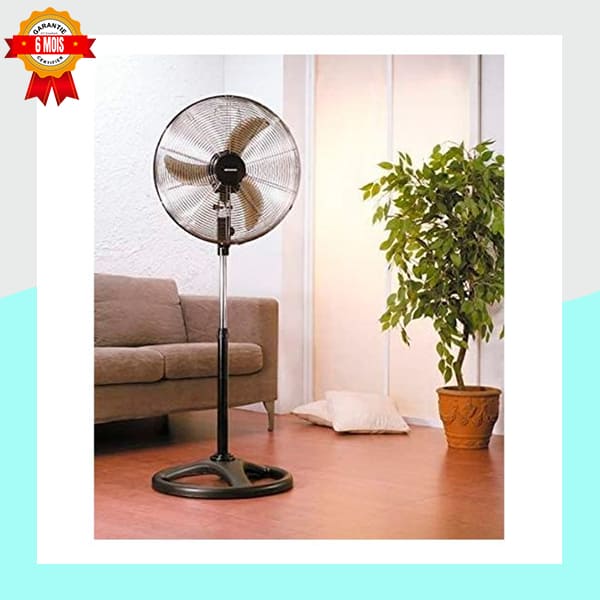 La hauteur est ajustable, et la fonction d’oscillation, si elle est présente (très probable sur ce type de modèle), distribue l’air frais sur une plus large zone. Sa base circulaire offre une excellente stabilité, tandis que le mélange de noir et de chrome sur le pied lui confère un look moderne et élégant. Bénéficiez d’une tranquillité d’esprit supplémentaire grâce à une garantie de 6 mois incluse.