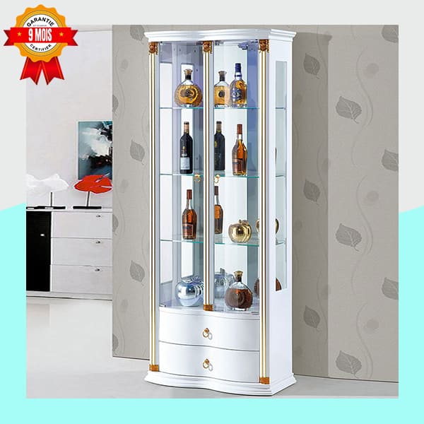 Cette vitrine bar est une pièce d’exception, alliant un design moderne et des touches luxueuses. Ses doubles portes en verre et ses étagères offrent une excellente visibilité pour vos bouteilles et verres. Le meuble est aussi équipé de tiroirs pour un rangement discret.